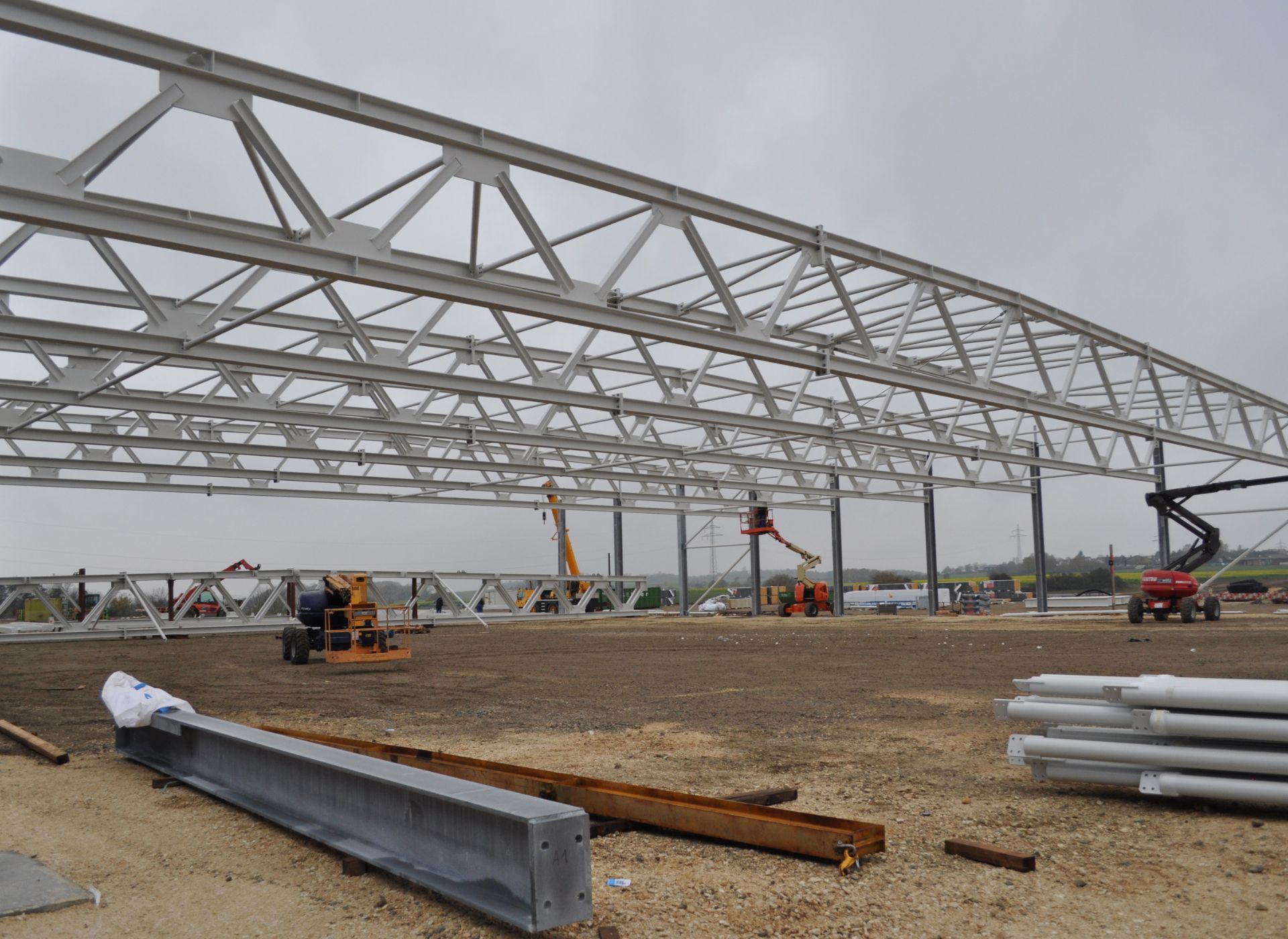 Für die Überdachung wurden über 450 Tonnen Stahl verarbeitet, darunter 28 Fachwerkträger mit einer beeindruckenden Länge von jeweils 49 Metern. Diese massive Konstruktion vereint Stabilität und Langlebigkeit und bietet optimalen Schutz für die LKWs – eine robuste und zukunftssichere Lösung für die Industrie.